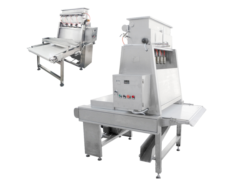 型號(hào)  PTJ600B型  功能  將糖漿均勻的噴灑在法餅表面上?! √厣 ?、噴糖漿的速度、狀態(tài)便于調(diào)節(jié),輸送帶變頻調(diào)速,具有自動(dòng)防跑偏裝置,清潔裝置,便于清洗維護(hù)?! ?、機(jī)器安全、防護(hù)、可靠、穩(wěn)定性高。電氣安全符合國家標(biāo)準(zhǔn)?! 〖夹g(shù)參數(shù)